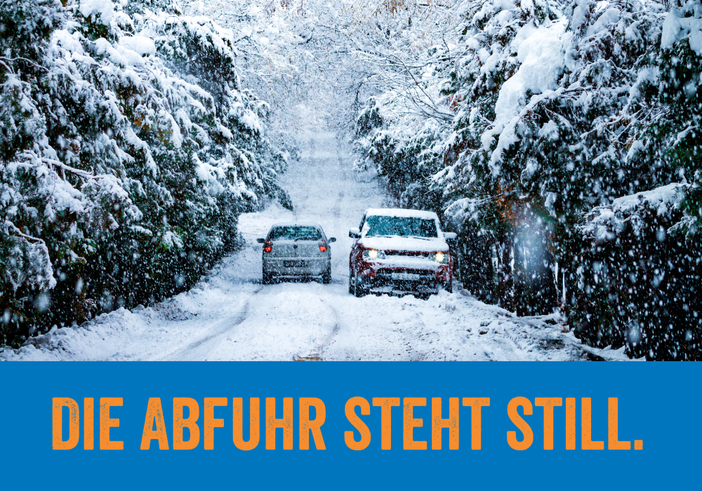 Eisglatte Straßen, extreme Bedingungen und der zu erwartende Neuschnee machen einen sicheren Einsatz aktuell unmöglich. Um unsere Mitarbeitenden und die Fahrzeuge zu schützen, steht die Abfuhr bis auf Weiteres still - auch am Samstag gibt es keine Nachleerung. Was das für dich und deine Abfalltonnen bedeutet erfährst du hier: